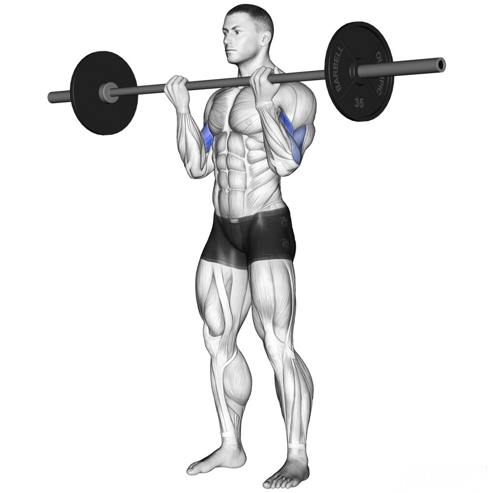 * Stand while holding the barbell at shoulder width with an underhand grip and elbows touching the side of the torso