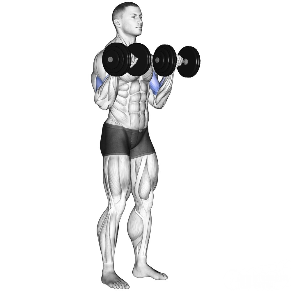 * Keeping your elbows near your torso, raise the dummbells until your forearms are vertical.