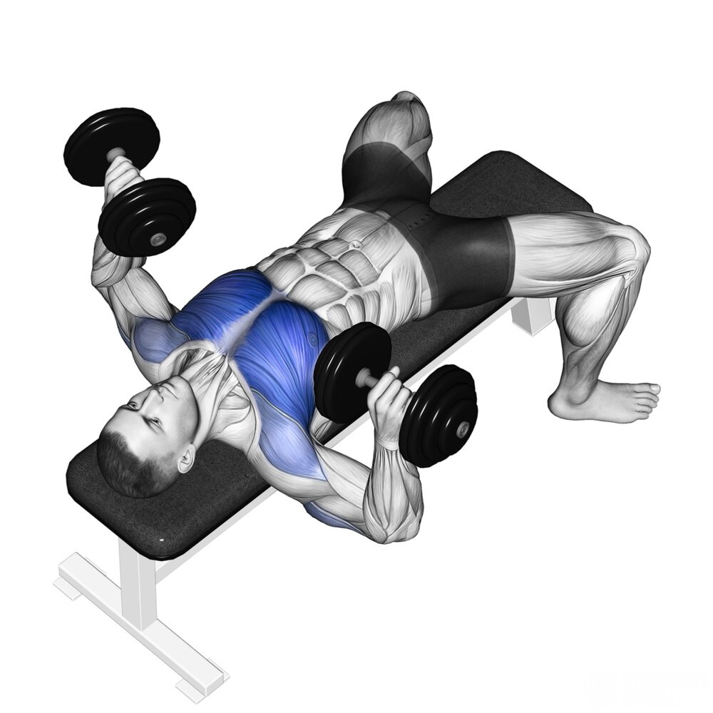 * After pausing at the bottom push the dumbbells towards the starting position, squeezing the chest.